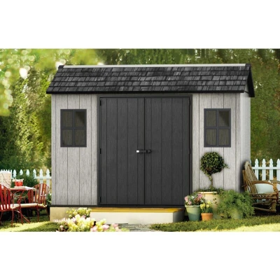 General description The Keter Oakland 1175 Composite Garden Shed is a functional and zero-maintenance outdoor storage solution designed to meet your storage needs season after season. Constructed for strength, it features rib-reinforced, double-wall Duotech panels that provide long-lasting durability without the hassle of wood maintenance. The shed's heavy-duty floor is built to withstand years of wear and tear while keeping out damp and dirt. With front-opening double doors, it offers easy access to bikes, furniture, gardening tools, and more. The innovative weather-proof DUOTECH™ walls mimic the appearance of real wood and can be painted and drilled, allowing for customization. The shed is designed for easy assembly with no special tools required. Technical specifications Assembled external dimensions: 350 x 229 x 254 cm (L x W x H) Internal dimensions: 324 x 201 x 242 cm (L x W x H) Weight: 243 kg Required base size: 342 x 210 cm External area coverage: 7.2 m² Internal area