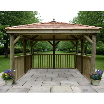 ShedstoreThe ideal home for a hot tub or spa, the 3.5m Square Gazebo with New England Cedar Roof (No Base) is handmade in the UK from premium materials and comes with a 15-year anti-rot warranty. This beautiful gazebo is built to last. Constructed from superior, kiln-dried pine, which is sourced from sustainable, well-managed forests, it has been pressure-treated and comes with a fantastic 15-year anti-rot warranty, so no further treatment is required, saving both time and money. The smooth sanded finish gives this wooden gazebo a stunning appearance. The New England cedar roof is fitted with a waterproof Tricoya® lining, which will keep the interior dry, whilst the balustrade infill panels are both tough and durable. The robust corner braces have been powder coated to resist rust. Measuring 3140mm x 3670mm x 3670mm, this garden gazebo also comes with a traditional timber roof, and with the option of a base. Sets of 4 water-repellent, fade-resistant, matching curtains are available which are made from tough outdoor marine canvas. Installation of this fantastic gazebo is included in the price. Free delivery is available to most UK addresses. 15-year anti-rot warranty Pressure-treated FSC®-certified, kiln-dried pine with smooth-sanded finish Waterproof-lined roof  Powder-coated corner braces to resist rust Customised curtains available Free delivery and installationÂ