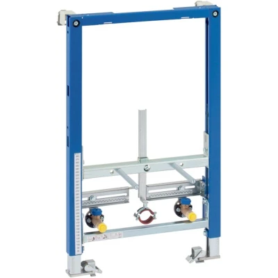 General description Geberit 111.543.00.1 Duofix Bidet Frame is designed for the installation of a wall-hung bidet with bolt fixings set at 180 or 230 mm centres. It is suitable for mounting in front of solid or drywall constructions and can be used in a partial-height Duofix system wall. Technical specifications Height: 0.82 m Frame with holes: 9 mm for fastening in wood frame construction Leg supports: Galvanised, steplessly adjustable from 0 - 200 mm Self-supporting frame with C profile: 40/40 mm Powder-coated finish: Geberit blue Retractable leg supports: Up to -50 mm for floor structures Rotating foot plate: For installation in UW50 and UW75 profiles Water connections: 2 x R 1/2" Angle stop valves: 2 x R 1/2" Threaded rods: 2 x M12 for ceramics fastening Compatibility and accessories Includes: 2 Duofix prewall brackets for system Extension bolts for larger ducts: 111.887.00.1 Backplate elbows and chrome isolating valves with 3/8 BSP connection Installation Designed for