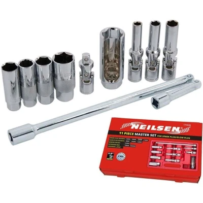 General description Neilsen 3/8" Long Glow Spark Plug Deep Square Metric Socket Set is designed for efficient and effective spark plug and sensor socket applications. This comprehensive set includes various sizes to accommodate different spark plug types and sensor configurations. Technical specifications Drive size: 3/8" Extension lengths: 75mm, 250mm Socket sizes: 8mm, 10mm, 12mm, 14mm, 16mm (including thin wall), 21mm, 22mm Material: Chrome vanadium