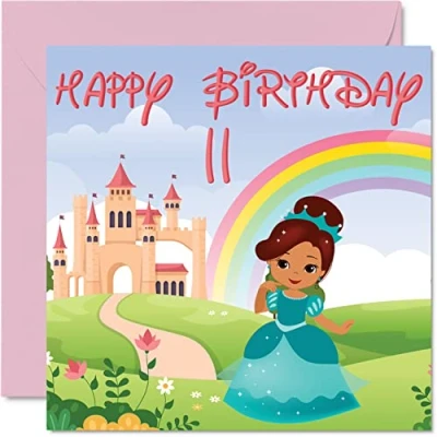 MAKE THEM SMILE WITH THIS BEAUTIFUL GIRL'S BIRTHDAY CARD: This exceptional quality birthday card for her shows the design of a Princess and a Castle with the phrase "Happy Birthday". If you are looking for funny birthday cards for girls, then then this happy birthday card is bound to make them laugh. Not just for friendship gifts for women this could also be for Daughter, Granddaughter, Grandchild, Niece, Cousin, or Goddaughter. WHAT DO YOU GET: The card is printed on one side and BLANK ON THE INSIDE to allow you to write your very own message. The unique fun design is printed on a specially sourced and environmentally responsible board. At 360 microns thick the natural white one-sided gloss board has a quality look and feel. Supplied with a coloured gummed envelope to complement the design and ready to be sealed and sent in the post. Niece birthday cards, birthday girl card. NO INK SMUDGES: There is nothing worse than writing inside a card to find that the shiny surface makes the ink smudge. This is why we use a high quality one sided coated board. The uncoated side will absorb more of the ink from your pen to make smudging a thing of the past. Birthday card niece, female birthday card, girl birthday card, kids birthday card, happy birthday cards for her. SIZES: Greeting Card = 145mm x 145mm, Envelope = 155mm x 155mm, Card Thickness = 360 micron. Great daughter birthday cards from Mum or Dad. Frozen birthday card for girl, kids birthday cards, childrens birthday cards, happy birthday niece card, birthday cards kids. MADE AND QUALITY CHECKED IN THE UK: We print and manufacture all our product right her in the UK so you can be sure of a fast turnaround and a product that is expertly made. Using environmentally responsible premium board our card is conscious of the responsible management of the world's forests - age 11 birthday card, birthday cards for kids, 11 birthday card girl.
