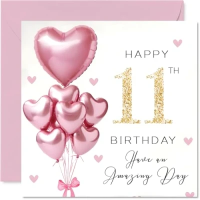 11th Birthday Cards for Girls Pink Glitter Balloons Happy Card 11 Year Old Girl Step Daughter Granddaughter Sister Daughter, 145mm Bday Greeting