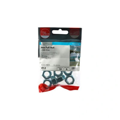 General description A traditional nut used for all bolting and fastening applications. Technical specifications Type: Hex Full Nuts Standard: DIN934 Size: M12 Finish: Zinc plated Usage: Internal use