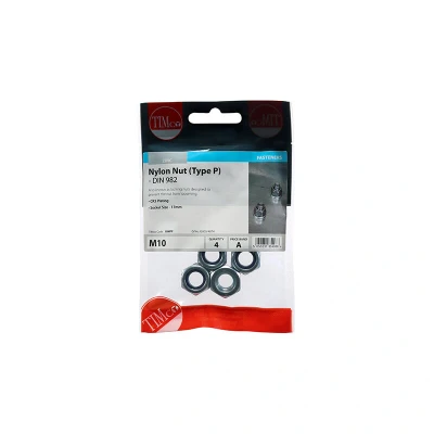 General description Type P hexagonal nylon insert nuts, also known as locking nuts, are designed to prevent loosening during use. They are suitable for a variety of bolting and fastening applications. Technical specifications Type: P hexagonal nylon insert nut Thread: Metric Size: M10 Color: Silver