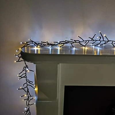 Light up your home and garden with a spectacular sparkle with this set of Christmas Cluster String Lights. Designed to create a bold, high-impact display, these lights are ideal for Christmas, weddings, parties, or adding year-round charm to any space.. Featuring an impressive 960 LEDs packed along an 12.4 metre lit length, these cluster lights sit on a green cable, giving a seamless and modern look. Designed to shine brighter and fuller than standard fairy lights, they wrap beautifully around trees, bannisters, pergolas, and fences, turning any space into something magical.. The multi-action function offers a variety of lighting effects – from a soft twinkle to a vibrant flash – and with a built-in memory, your chosen setting is saved even after switching off. The 8 hour on / 16 hour off timer adds everyday convenience, ensuring your lights turn on automatically at the same time each evening. Mains powered with a 10 metre lead, they offer flexibility in placement.. Suitable for indoor and outdoor use.. Product Specifications. 960 White and Warm White Multi-Action LEDs on Green Cable. Height: 5cm Length: 22.4m Width: 1cm. 12.4m Lit Length. Mains Powered with 10m Cable. Timer Function 8 hours on 16 hours off