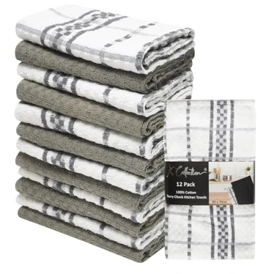 PURE COTTON: 100% Pure Cotton Check Kitchen Towels by K Collection. Woven with 100% ring spun cotton making these towels durable and strong for all household chores MULTIPURPOSE: Maintain your kitchen surfaces or wipe your hands, while preparing your favourite cuisines, with these premium quality kitchen towels. Made of 100% cotton fabric, these towels possess breathable characteristics which make them perfect for polished surfaces and your hands. Being terry in nature, theses weaves are the most absorbent of all kind with loops on both sides that create extra surface area for completely drying off all surfaces. 12 PACK GREY: Set includes 12 cotton dish towels with Six Grey and Six White dobby weave style kitchen towels measuring 16" (40cm) x 28" (70cm), each towel is a minimum 285GSM to ensure durability and the pack of 12 represents amazing value ECO FRIENDLY: The environmentally friendly alternative to paper towels and tissues. Made with sustainable, environment friendly 100% cotton for daily use, free from harmful chemicals or synthetic materials, safe for you & your family. Do not use bleach, fabric softeners, and iron as it may damage its quality; always wash the towels separately to minimize lint. Machine wash the towels in warm water using mild detergent and tumble dry on low; recommended to dry immediately to minimize mildew SHOP K COLLECTION: Complete your kitchen/bedroom/wardrobe with our other K Collection products - Coordinating products and accessories available.