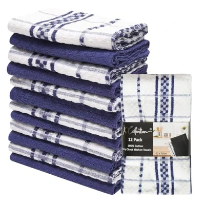PURE COTTON: 100% Pure Cotton Check Kitchen Towels by K Collection. Woven with 100% ring spun cotton making these towels durable and strong for all household chores MULTIPURPOSE: Maintain your kitchen surfaces or wipe your hands, while preparing your favourite cuisines, with these premium quality kitchen towels. Made of 100% cotton fabric, these towels possess breathable characteristics which make them perfect for polished surfaces and your hands. Being terry in nature, theses weaves are the most absorbent of all kind with loops on both sides that create extra surface area for completely drying off all surfaces. 12 PACK NAVY: Set includes 12 cotton dish towels with Six Navy and Six White dobby weave style kitchen towels measuring 16" (40cm) x 28" (70cm), each towel is a minimum 285GSM to ensure durability and the pack of 12 represents amazing value ECO FRIENDLY: The environmentally friendly alternative to paper towels and tissues. Made with sustainable, environment friendly 100% cotton for daily use, free from harmful chemicals or synthetic materials, safe for you & your family. Do not use bleach, fabric softeners, and iron as it may damage its quality; always wash the towels separately to minimize lint. Machine wash the towels in warm water using mild detergent and tumble dry on low; recommended to dry immediately to minimize mildew SHOP K COLLECTION: Complete your kitchen/bedroom/wardrobe with our other K Collection products - Coordinating products and accessories available.