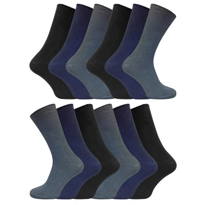 Men’s 12 Pair Value Pack Non Elastic 100% Cotton Socks100% cotton socks are an essential item if you are looking for the ultimate comfort that cotton has to offer and making sure you’ve got enough to last is a must! These non elastic 100% cotton socks provide just that, now in a great 12 pair value pack! These socks are also non elastic / non-binding giving you extra comfort throughout the day.100% cotton socks are perfect if you are looking for lightweight socks that are super comfortable. These socks are also breathable and fantastic for the summer months. Where these socks are different from ordinary 100% cotton socks is that they are non-elastic. They are perfect for people who suffer from poor circulation and are suitable for anyone with swollen feet or legs.As of their cotton content these socks are breathable and will help keep feet cool and fresh. This means there is less risk of socks becoming uncomfortable and also means there is less chance of blistering. These socks stretch to the natural contours of your feet, meaning no more nasty constriction rings. However they are not too loose so that they will fall down.These socks are fully ribbed to help keep them up, and are great for everyday wear, or as light, thin pairs of formal socks. Everyday technology for any man's feet! These socks come in 12 pairs, are available in 6-11 UK and 12-14 UK and are available Black, Brown and Black/Navy/Grey. They are Machine Washable.Extra Product DetailsMen’s 12 Pack Cotton Socks100% Super Soft CottonValue For MoneyExtra ComfortNon-Elastic TopRibbed DesignCasual Or Formal WearLoose Top, No IrritationSize 6-11 UK or 11-14 UKMachine Washable