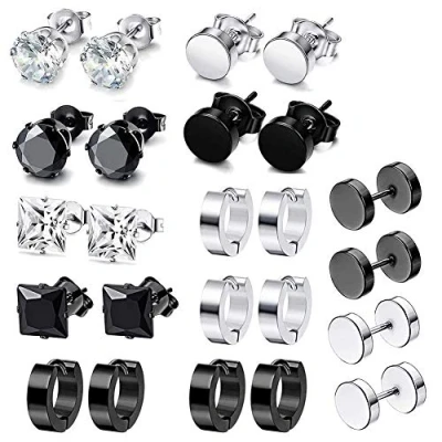 High quality material: Stainless steel stud earrings set is made of stainless steel,never rust and tarnish resistance,classic stud design,enhances your temperament,good plated make it keep color retention Size: Stainless steel earrings hoops:3*9mm/0.1"*0.35",4*9mm/0.2"*0.35". Barbell stainless steel earrings:6mm/0.24". CZ stud earrings:6mm/0.24" Features: Polished surface,they are very smooth,can keep color from fading for a long time,comfortable to wear,besides,suitable for both men or boys,can match your daily wearings More choices: 12 pairs men stainless steel earrings studs set,to meet your needs in different occasion,and match your different outfits,make you different,catch more eyes on you Occasions: 12 pairs stainless steel stud earrings for attend paties,weddings or something inportant occasion,providing your more choices,meeting your daily needs