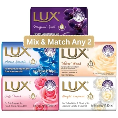 VARIETY PACK: Mix and match any two 80g soap bars from the luxurious collection - Magical Spell, Aqua Sparkle, Soft Touch, Velvet Touch and Bright Impress FRAGRANT EXPERIENCE: Each bathing bar is infused with delightful fragrances that transform your daily shower into a pampering ritual SKIN BENEFITS: Specially formulated to provide smooth, soft and nourished skin with regular use whilst maintaining skin's natural moisture GENEROUS SIZE: Each soap bar weighs 80 grams, providing long-lasting usage for your daily bathing needs PREMIUM QUALITY: Rich, creamy lather delivers a sumptuous cleansing experience, suitable for all skin types
