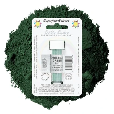 Sugarflair Christmas Green Edible Lustre Dust is versatile and can either be brushed onto cakes and decorations or mixed with rejuvenator spirit to create an eye-catching edible paint for sparkling cakes or glamorous sugar cake decorations. Gleaming Lustre Dust to Transform your Cakes, Bakes and Decorations - Use these high-quality edible dusting powders for adding lustrous shine to your bakes. Available in an Extensive Range of over 40 Unique Glistening Colours. 100% Edible Lustre Powder Food Colouring - All products in the Sugarflair Lustre Dust collection are completely edible and leave a shimmering lustrous shine on cakes and decorations Sugarflair Colours Edible Lustre Dust range has a lustrous colour to match any cake theme or occasion. Each powder comes in a space-saving vial with a screw-on cap to keep your dust fresh, ready to use and easy to store. Nut Free, Gluten Free, GM Free, Kosher. Suitable for Vegetarians and Vegans