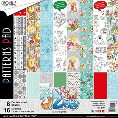 CBT025 - 12"x12" Patterns Pad Zoe & Ziggy Ciao Bella Patterns Pad. 12"x12". 1 each of 8 double-sided papers. 1 designs plus one additional design in the cover with 3 cards. Ciao Bella paper collections are manufactured in Italy with organic inks on forest-friendly certified paper by a carefully selected team of specialist and traditional printing professionals. The versatile patterns and styles, original illustrations and exciting colour palettes mean the papers can be used for both scrapbooking, mixed media, arts and crafts or home decor. High quality certified Italian Paper. 190gsm. FSC Certified.