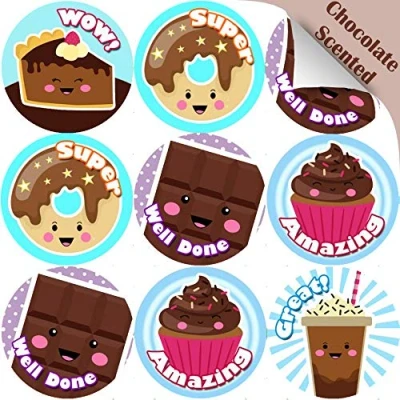 120 Chocolate Praise Words 30mm Scented Reward Stickers for Teachers, Parents and Party Bags