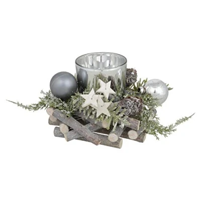 12cm Round Wooden Christmas Candle Holder Decoration Rustic Grey Sticks Silver Baubles White Stars Pine Cones Tealight Votive Festive Tabletop