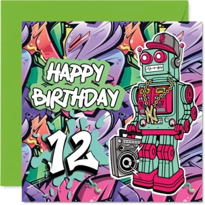 12th Birthday Cards for Boys Wicked Graffiti Robot Happy Card 12 Year Old Boy Brother Cousin Godson Grandson, 145mm Bday Greeting