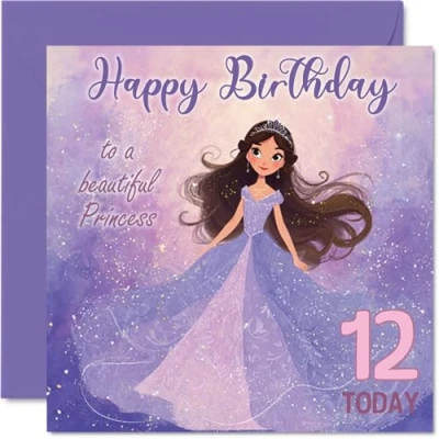 12th Birthday Cards for Girls Princess in Purple Happy Card 12 Year Old Girl Daughter Niece Cousin Sister, 145mm Bday Greeting