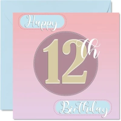 MAKE HER SMILE WITH THIS UNIQUE BIRTHDAY CARD: This exceptional quality birthday card for her shows the design 'Happy 12th Birthday'. If you are looking for special birthday greetings cards for Girls birthday card then then this happy birthday card is bound to make her smile. Not just for birthday gifts for Girls this could also be for Cousin, Daughter, Granddaughter, Niece, Sister, Goddaughter, Step Daughter or Great Niece. WHAT DO YOU GET: The card is printed on one side and BLANK ON THE INSIDE to allow you to write your very own message. The unique fun design is printed on a specially sourced and environmentally responsible board. At 360 microns thick the natural white one-sided gloss board has a quality look and feel. Supplied with a coloured gummed envelope to complement the design and ready to be sealed and sent in the post. Great Cousin birthday cards, 12th birthday card, Daughter birthday card. NO INK SMUDGES: There is nothing worse than writing inside a card to find that the shiny surface makes the ink smudge. This is why we use a high quality one sided coated board. The uncoated side will absorb more of the ink from your pen to make smudging a thing of the past. 12th Birthday card for Granddaughter, 12th Birthday card for Niece, 12th Birthday card for Sister. SIZES: Greeting Card = 145mm x 145mm, Envelope = 155mm x 155mm, Card Thickness = 360 micron. Goddaughter 12th birthday card, birthday cards for Step Daughter, cute birthday cards for Great Niece, 12th birthday card Cousin, Daughter 12th birthday card. MADE AND QUALITY CHECKED IN THE UK: We print and manufacture all our products right here in the UK so you can be sure of a fast turnaround and a product that is expertly made. Using environmentally responsible premium board our card is conscious of the responsible management of the world's forests - perfect birthday cards for Girls, fun birthday cards for her, Daughter 12th birthday cards, female birthday cards.