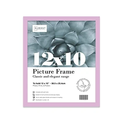 Standard photograph size, 12" x 10" (31 x 25cm) The picture frame moulding is 20mm wide and 16mm deep Comes with a kick-stand to display your artwork either vertically and horizontally. Fold-out wall hooks for horizontal and vertical wall hanging. Stylish thin Lilac picture frame for an 12x10 inch print, poster, or photo External frame dimensions are: 13.4 x 11.3 Inches - 33.8 x 28.7 cm