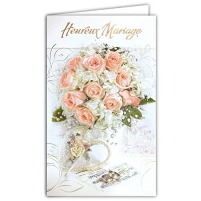 13 6142 ARGUS Card with White Envelope Happy Wedding Shines RELIEF Bouquet of Bride Roses 2 Rings Heart Necklace Pearl Paper Embossed Congratulations Traditional Style