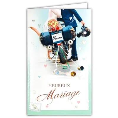 13 6159 Card with Envelope Happy Wedding Just Married Congratulations to the Bride and Groom for Couples Men/Women Motorcycle Biker Bouquet of Flowers Rings Love Hearts