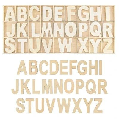 Alphabet: 130-piece wooden alphabet set with uppercase letters from A-Z - 5 pieces of each. The wooden alphabet comes in a flat storage box with compartments for sorting, making it easy to access and store. The wooden alphabet letters are up to 3cm in size and the wooden tray measures 11 cm x 30 cm x 1,5 cm. Crafts: You can get creative by arranging these letter cutouts to make names and sentences. Wide range of uses: These letters can be used in a variety of craft projects, including scrapbooking, card making, decoration making and more. They can also be used as a learning aid to help with spelling, letter recognition and writing.