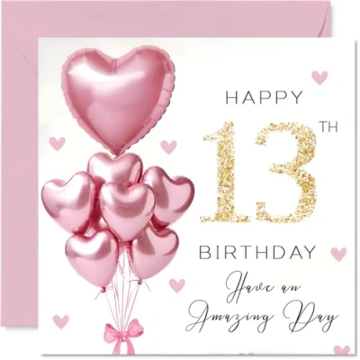 13th Birthday Cards for Girls Pink Glitter Balloons Happy Card 13 Year Old Girl Goddaughter Great Niece Granddaughter Step Daughter, 145mm Bday Greeting