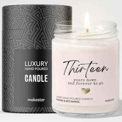 13th Wedding Anniversary Candle Gift Luxury Soy Wax Vanilla, Jasmine, Sugared Almond Makester