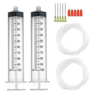 【Package Included】-14 Pcs/set, contain 2pcs 100ml luer lock syringes, 5pcs 1.5in 14g blunt needles, 5pcs orange syringe caps, 2pcs 5mmx3mmx80cm transparent tubes. 【Luer Lock Connection】- The luer lock is a connector can prevent the needle falls off from the syringes. 【Widely Use】- 100ml large plastic syringe with tubing, can be used for the injection and discharge of gasoline or frozen liquid in the car, the measurement of hydroponic nutrient solution, filling glue, ink, lubricant, etc., can also be used for feeding pets. 【Clear Scale】-Syringe scale is clear, easy to read, 50ml interval scale can help accurately measure liquid. 【Warm Note】- For industrial use, not for medical!