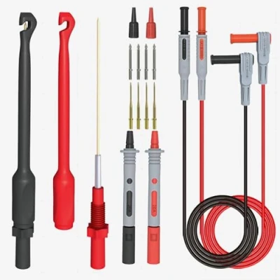 Both ends of this test leads are injection molded standard 4mm banana plugs. Straight plug to right angle plug. Length: 3 ft. The inner core of the test lead is oxygen-free copper wire. The material of the banana plug is pure copper, and the injection layer is ABS + PA. So the test lead is more soft, easy to use and has a long service life. Piercing probes can puncture and clamp the cables, freeing your hands. There is no need to strip or damage the cable during use. Suitable for piercing cables with a diameter less than 4mm. The end of the probes is a 4mm standard banana socket, which can be perfectly connected with the attached test leads. With the puncture mode in the opposite direction, the puncture effect will be better. Package include: 2PCS male to male 4mm banana plug multimeter test leads, 2PCS wire piercing probes red + black, 8PCS replaceable probes set.
