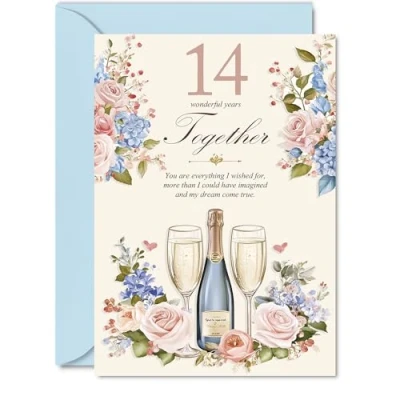 14th Anniversary Card for Men Women Floral Champagne Happy 14 Year Husband Partner Wife Girlfriend, 5x7 Inch Wedding Anniversaries Greeting Cards