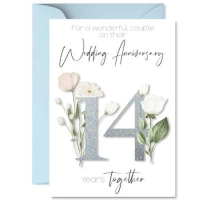 MAKE THEM SMILE WITH THIS ROMANTIC ANNIVERSARY CARD: This exceptional quality anniversary card for her or him shows the design 'For a Wonderful couple on their Wedding Anniversary 14 Years Together'. If you are looking for special anniversary greetings cards for Women anniversary card then then this happy anniversary card is bound to make them smile. Not just for anniversary gifts for Men this could also be for Girlfriend, Partner, Wife, Husband, Companion or Boyfriend. WHAT DO YOU GET: The cards are printed on both sides with the inside print saying 'Have a Lovely Day' and ample space for your own personal message. The unique fun design is printed on a specially sourced and environmentally responsible board. At 360 microns thick the natural white one-sided gloss board has a quality look and feel. Supplied with a coloured gummed envelope to complement the design and ready to be sealed and sent in the post. NO INK SMUDGES: There is nothing worse than writing inside a card to find that the shiny surface makes the ink smudge. This is why we use a high quality one sided coated board. The uncoated side will absorb more of the ink from your pen to make smudging a thing of the past. 14th anniversary card for Wife, 14th anniversary card for Husband, 14th anniversary card for Companion. SIZES: Greeting Card = 148mm x 210mm, Envelope = 150mm x 212mm, Card Thickness = 360 micron. Companion 14th anniversary card, anniversary cards for Wife, cute anniversary cards for Husband, 14th anniversary card Girlfriend, Partner 14th anniversary card. MADE AND QUALITY CHECKED IN THE UK: We print and manufacture all our products right here in the UK so you can be sure of a fast turnaround and a product that is expertly made. Using environmentally responsible premium board our card is conscious of the responsible management of the world's forests - perfect anniversary cards for Men, cute anniversary cards for her, Partner 14th anniversary cards, female anniversary cards.