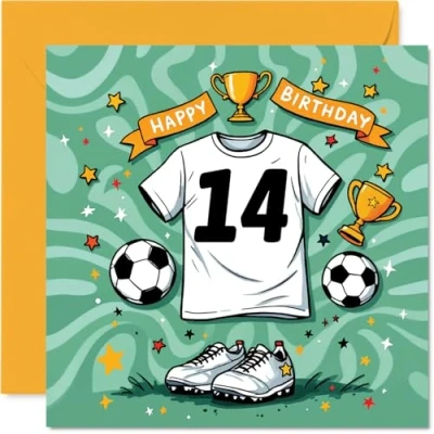 14th Birthday Cards for Girls Boys Football Shirt Happy Card 14 Year Old Girl Boy Son Grandson Niece Brother, 145mm Bday Greeting