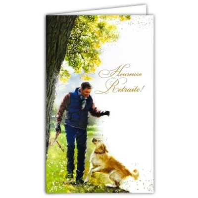 15 6525 Happy Retirement Card with Envelope for Men Active Sporty Walking the Dog Labrador Retriever Hiking in Nature Jeans Casual Made Europe