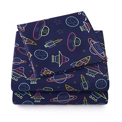 1500 Supreme Kids Bed Sheet Collection Fun Colorful and Comfortable Boys Girls Toddler Sets Deep Pocket Wrinkle Free Soft Cozy Bedding Full, Neon Spaceships