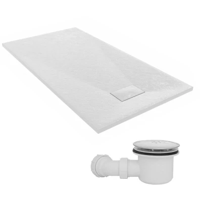 1500 x 800mm smc White Rectangle Slate Effect Bathroom Shower Tray & Fluidmaster Fast Flow Waste Trap NRG