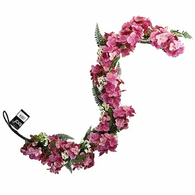 Artificial pink blossom garland Foliage width as we have it arranged is 150cm x 30cm x 20cm approximately when totally outstretched from end to end Stems are plastic and flowers are silk This is arrangeable and it is wired inside the stems so you can shape the garland to fit your space This is a handmade item and there are minor differences between garlands