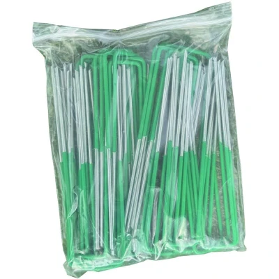 General description A set of high-quality galvanized steel and half plastic-coated garden U pins, designed for fixing down rolls of artificial grass, with the green coating blending in with the turf. These pins also work effectively for staking down weed control fabric. Technical specifications Material: Galvanized steel with half plastic coating Length: 150mm Width at base: 30mm Thickness: 3mm Pack size: 50 pins Usage Ideal for securing artificial grass rolls Effective for staking down weed control fabric
