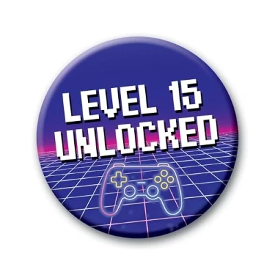 15th Birthday Badge 76mm Level 15 Unlocked Pin Button Video Game Gift for Boys