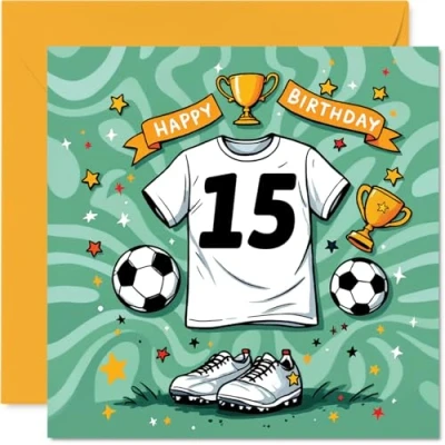 15th Birthday Cards for Boys Girls Football Shirt Happy Card 15 Year Old Boy Girl Grandson Cousin Son Niece, 145mm Bday Greeting