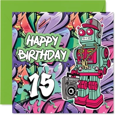 15th Birthday Cards for Boys Wicked Graffiti Robot Happy Card 15 Year Old Boy Nephew Son Great Cousin, 145mm Bday Greeting