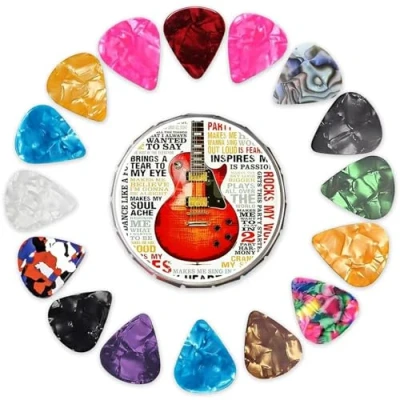 Guitar Picks Variety Pack: A total of 16guitar picks in 3 different thicknesses: Thin (0.46mm); Medium (0.71mm); Heavy (0.96mm). A set of different thicknesses allows you to learn which gauge is best for you. Perfect choice for guitar beginners, players or professionals. Easy to Carry : Guitar picks for electric guitar With a metal click clack box which can be put into your pocket or guitar case,avoid losing medium guitar picks again. (Note: Press the tin box center of the lid to open it and squeeze the sides of the lid to close). High Quality: High quality celluloid classic guitar picks provides a natural feel and warm tone for comfortable playing on electric, acoustic, bass guitar, banjo or ukulele. The variety of widths and differing flexibility will suit all styles of music and playing preferences. Multiple Bright Colors: This is a great collection of guitar picks with picks in various colors and widths. Multiple options to match different preferences or guitar styles. A Delightful Gift: Exquisite Guitar Picks set is a perfect musical gift for family or friends on any festival such as Christmas, Father's Day, Mother's Day, Birthday or Children's Day.