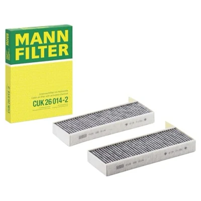 MANN-FILTER Cabin Air Filter CUK 26 014-2 (set of 2) / Dimensions (mm): A = 259; B = 98; H = 32 / Premium Filter in Original Equipment Quality High-quality MANN-FILTER cabin filters with active carbon - nearly 100% protection from particles like pollen, diesel soot & tyre abrasion / Additional protection from harmful gases & unpleasant odour The trated highly-effective activated carbon gives protection against harmful gases such as ozone, nitrogen oxide or sulphur dioxide and eliminates unpleasant odours during the entire service interval Looking to find the correct filter? Select: brand, model, vehicle type, and engine type above to see which one fits your vehicle MANN+HUMMEL complies with REACH-regulation + supports the goal of Improved health and safety through the design, manufacturing, usage, disposal and recycling of our products