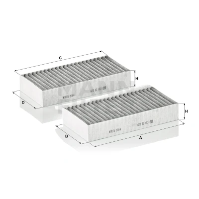 MANN-FILTER Cabin Air Filter CUK 26 028-2 (set of 2) / Dimensions (mm): A = 254; B = 115; H = 40 / Premium Filter in Original Equipment Quality High-quality MANN-FILTER cabin filters with active carbon - nearly 100% protection from particles like pollen, diesel soot & tyre abrasion / Additional protection from harmful gases & unpleasant odour The trated highly-effective activated carbon gives protection against harmful gases such as ozone, nitrogen oxide or sulphur dioxide and eliminates unpleasant odours during the entire service interval Looking to find the correct filter? Select: brand, model, vehicle type, and engine type above to see which one fits your vehicle MANN+HUMMEL complies with REACH-regulation + supports the goal of Improved health and safety through the design, manufacturing, usage, disposal and recycling of our products