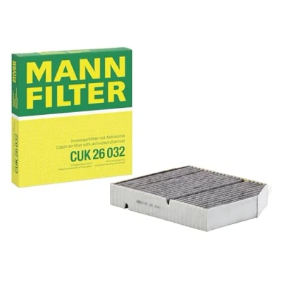 MANN-FILTER Cabin Air Filter CUK 26 032 / Dimensions (mm): A = 259; B = 247; H = 40 / Premium Filter in Original Equipment Quality High-quality MANN-FILTER cabin filters with active carbon - nearly 100% protection from particles like pollen, diesel soot & tyre abrasion / Additional protection from harmful gases & unpleasant odour The trated highly-effective activated carbon gives protection against harmful gases such as ozone, nitrogen oxide or sulphur dioxide and eliminates unpleasant odours during the entire service interval Looking to find the correct filter? Select: brand, model, vehicle type, and engine type above to see which one fits your vehicle MANN+HUMMEL complies with REACH-regulation + supports the goal of Improved health and safety through the design, manufacturing, usage, disposal and recycling of our products