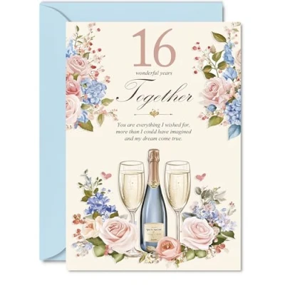 16th Anniversary Card for Men Women Floral Champagne Happy 16 Year Companion Wife Partner Husband, A5 Wedding Anniversaries Greeting Cards