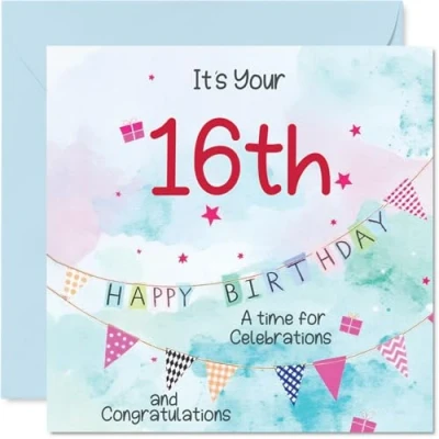 MAKE HIM SMILE WITH THIS UNIQUE BIRTHDAY CARD: This exceptional quality birthday card for him shows the design 'Its your 16th Happy Birthday A time for celebrations and congratulations'. If you are looking for special birthday greetings cards for Boys birthday card then then this happy birthday card is bound to make him smile. Not just for birthday gifts for Boys this could also be for Brother, Son, Godson, Step Son, Nephew, Cousin, Grandson or Great Nephew. WHAT DO YOU GET: The card is printed on one side and BLANK ON THE INSIDE to allow you to write your very own message. The unique fun design is printed on a specially sourced and environmentally responsible board. At 360 microns thick the natural white one-sided gloss board has a quality look and feel. Supplied with a coloured gummed envelope to complement the design and ready to be sealed and sent in the post. Great Brother birthday cards, 16th birthday card, Son birthday card. DESIGNED FOR WRITING: There is nothing worse than writing inside a card to find that the shiny surface makes the ink smudge. This is why we use a high quality one sided coated board. The uncoated side will absorb more of the ink from your pen to make smudging a thing of the past. 16th Birthday card for Godson, 16th Birthday card for Step Son, 16th Birthday card for Nephew. SIZES: Greeting Card = 145mm x 145mm, Envelope = 155mm x 155mm, Card Thickness = 360 micron. Cousin 16th birthday card, birthday cards for Grandson, cute birthday cards for Great Nephew, 16th birthday card Brother, Son 16th birthday card. MADE AND QUALITY CHECKED IN THE UK: We print and manufacture all our products right here in the UK so you can be sure of a fast turnaround and a product that is expertly made. Using environmentally responsible premium board our card is conscious of the responsible management of the world's forests - perfect birthday cards for Boys, fun birthday cards for him, Son 16th birthday cards, female birthday cards.