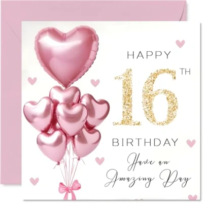 16th Birthday Cards for Girls Pink Glitter Balloons Happy Card 16 Year Old Girl Cousin Daughter Niece Great Niece, 145mm Bday Greeting