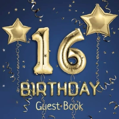 16th Birthday Guest Book: Message Logbook and Book for Party 100 Pages Guests to leave their Comments & Wishes Blue Cover with Golden Balloons