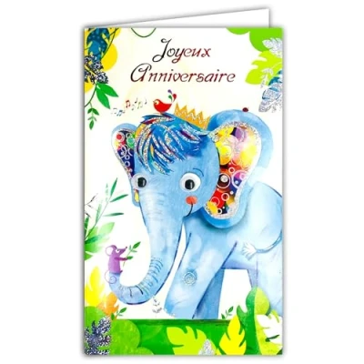 17 6038 Happy Birthday Card with Envelope for Children, Boy, Girl, Elephant, Blue Crown, Animal King, Mouse, Singing Bird, Ladybugs, Youth Illustration, Made in Europe