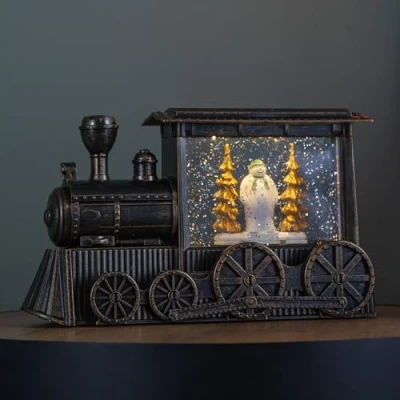 All aboard the Christmas express! Add a touch of festive magic to your decor with this charming 17cm Battery Operated Light up Christmas Train Water Spinner with The Snowman and Snowdog. Whether displayed on a mantelpiece, shelf, or windowsill, this festive piece adds nostalgic charm and light to your seasonal display.. At the heart of this beautifully designed black and bronze decoration is a heartwarming scene featuring the beloved characters The Snowman and The Snowdog, brought to life with light and movement. Crafted in the shape of a vintage style train engine, The Snowman and The Snowdog are surrounded by a swirling flurry of silver glitter, creating a continuous snowstorm effect that sparkles as it moves. A warm white LEDs softly illuminate the scene from within, casting a gentle, golden glow that enhances every glittering swirl. Powered by 3 x AA batteries for easy placement without the hassle of plugs and wires.. Suitable for indoor use only.. Product Specifications. Warm White LEDs. Height: 17cm Length: 25cm Width: 9cm. Requires 3 x Batteries